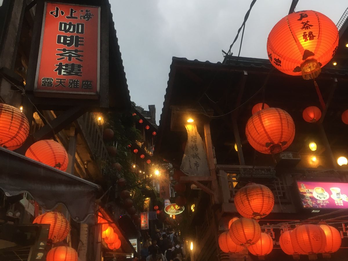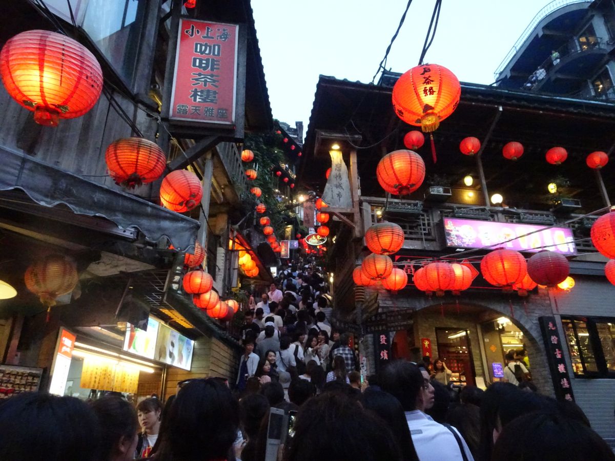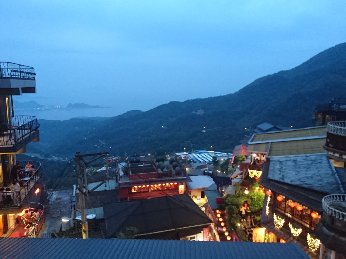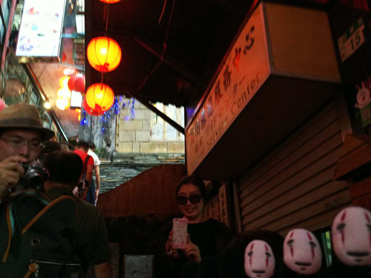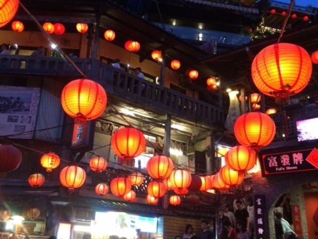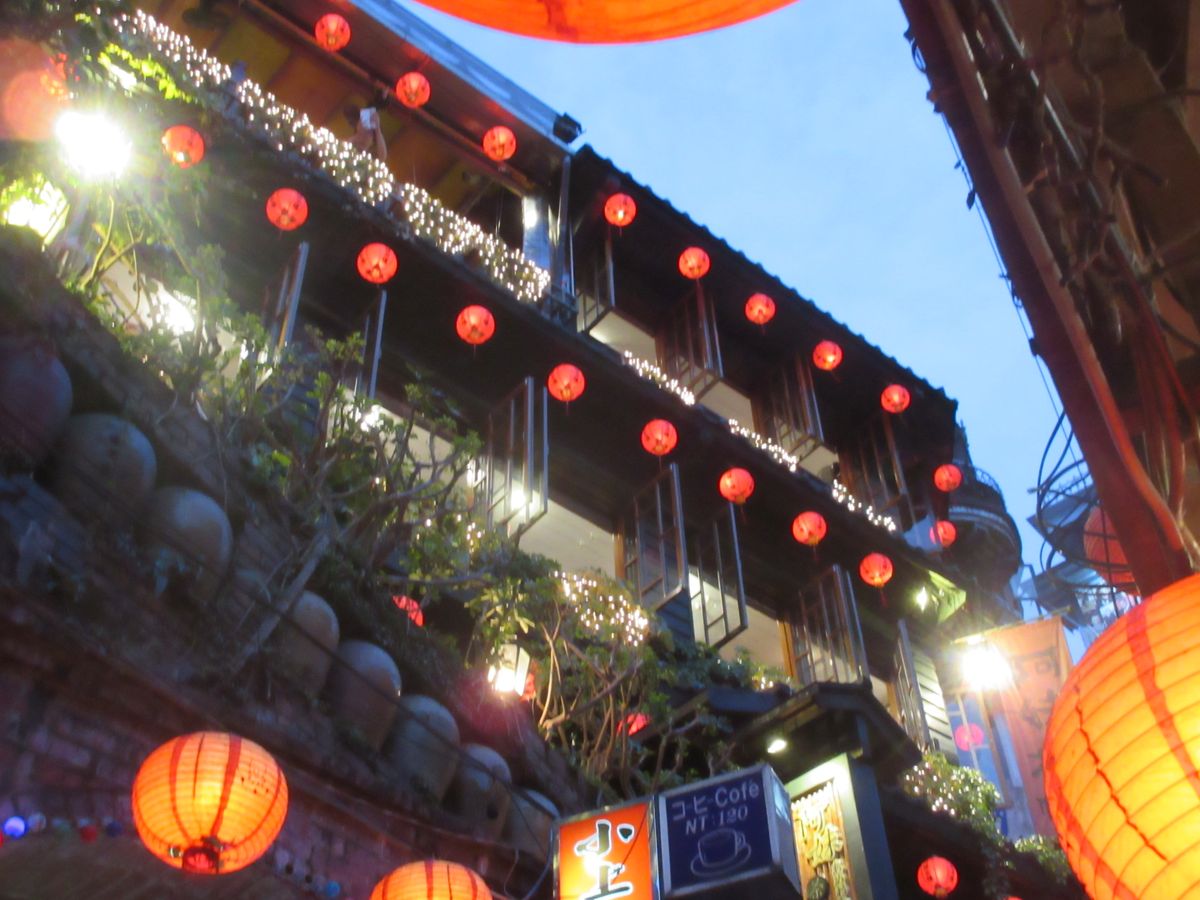 初めての台湾で、台北といえば九份へ行きたいとまず思いましたが、自力で九份まで行く自信が無かったので、ツアーに申し込みました。まず集合してバスに乗り込んで早々に市内での夕食でした。期待は全くしておりませんでしたので、やはり予想通りの内容でした。夕方5時頃で全くお腹も空いておらず、いたって普通の鍋の様な物で、ほとんど食べられませんでした。そして九份へ。ガイドさんの楽しい話しを聞いている間に、3.40分程であっという間に到着しました。九份は年間200日は雨と言ってましたが、見事に雨が降ってきました。夜の九份、とても雰囲気があり、提灯の明かりが幻想的で独特な場所でした。九份自体は見て回るには30分程で一回り出来る程の規模でした。夜市もとても活気があり、毎夜開催されているのかと感心する程の活気と熱気でした。思った以上にスムーズな行程で、ツアーに参加して正解でした。