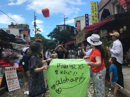 十分ではランタンにお願いを書く姿やあげる瞬間などの写真・動画をお店の方と手分けして撮って下さいました。その後、十分の見所をガイドしながら線路の上や十分幸福の壁でのショットも沢山撮って下さいました。