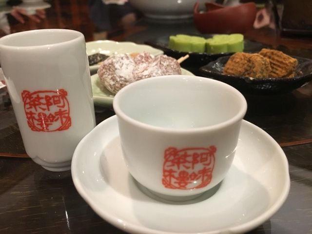 お茶屋さんは非常に混んでいて、丸テーブルで同じバスの方との相席でした。他の方と会話をしながらおいしいお茶とお茶菓子を堪能したのですが、少しゆっくりし過ぎてしまい、後悔。