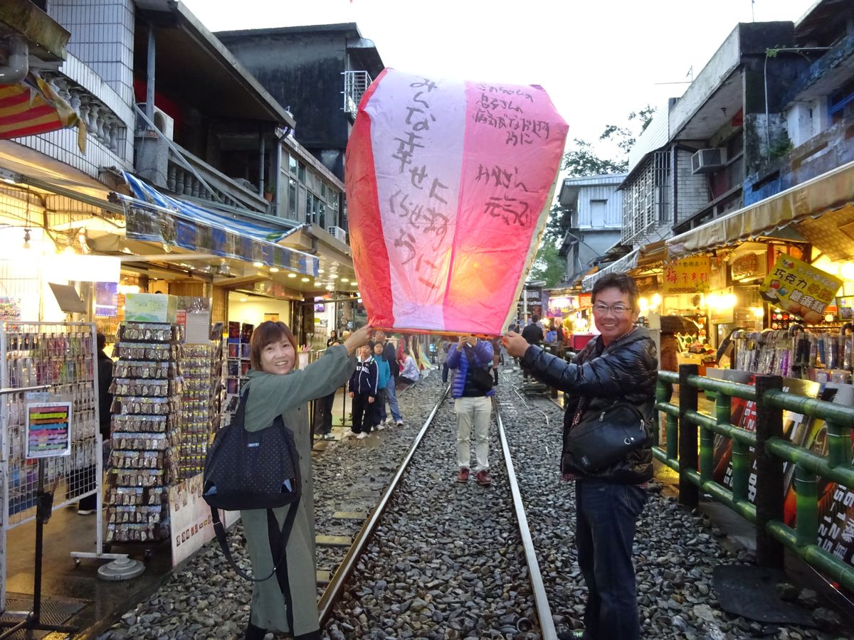 ちょうど電車が通る瞬間を見ることが出来、天燈上げでは、それぞれのテーマの願い事を考え、筆で書くという、大人でも楽しめる、良い体験が出来ました。ゆうさんが写真・ビデオを撮ってくれ、良い思い出となりました!