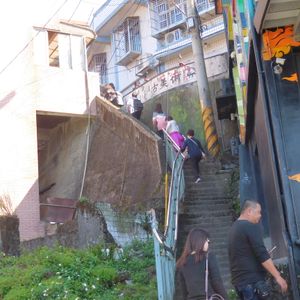 4月初めの土曜の夕刻に行きました。以前早朝に行ったことがあるのですがそのときは「あめおちゃ(阿妹茶)」でゆるりとした時間が楽しめました。しかし今回はその余裕は無い。バス駐車場が一番下だったので階段を登って行ったが階段で写真を撮る人間が多くなかなか上に登れない。お茶は断念、頂上の小学校まで登るので精一杯。