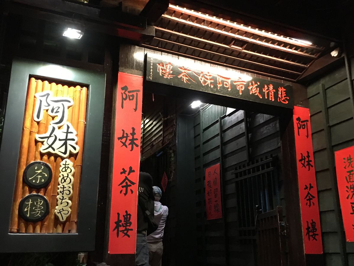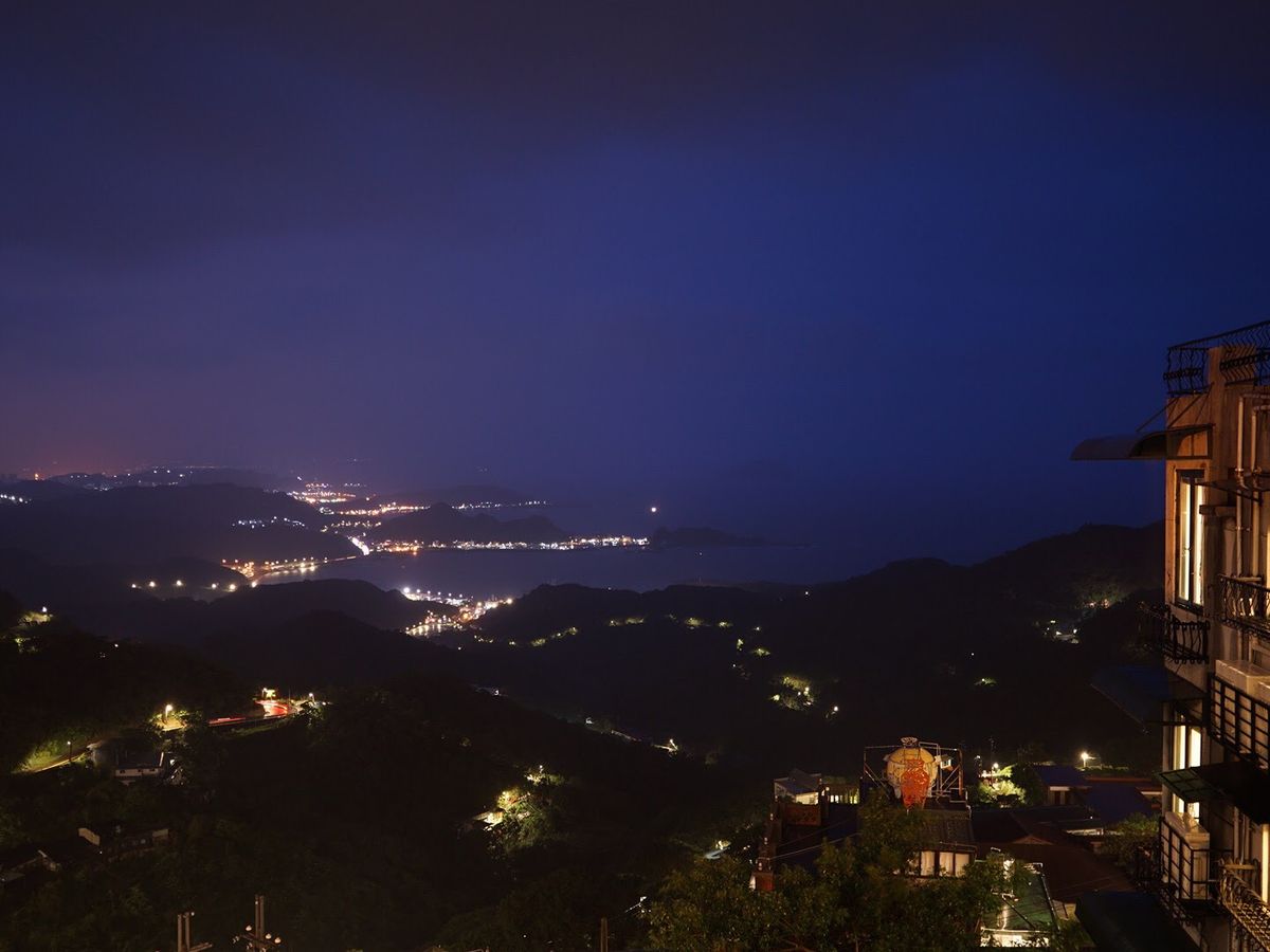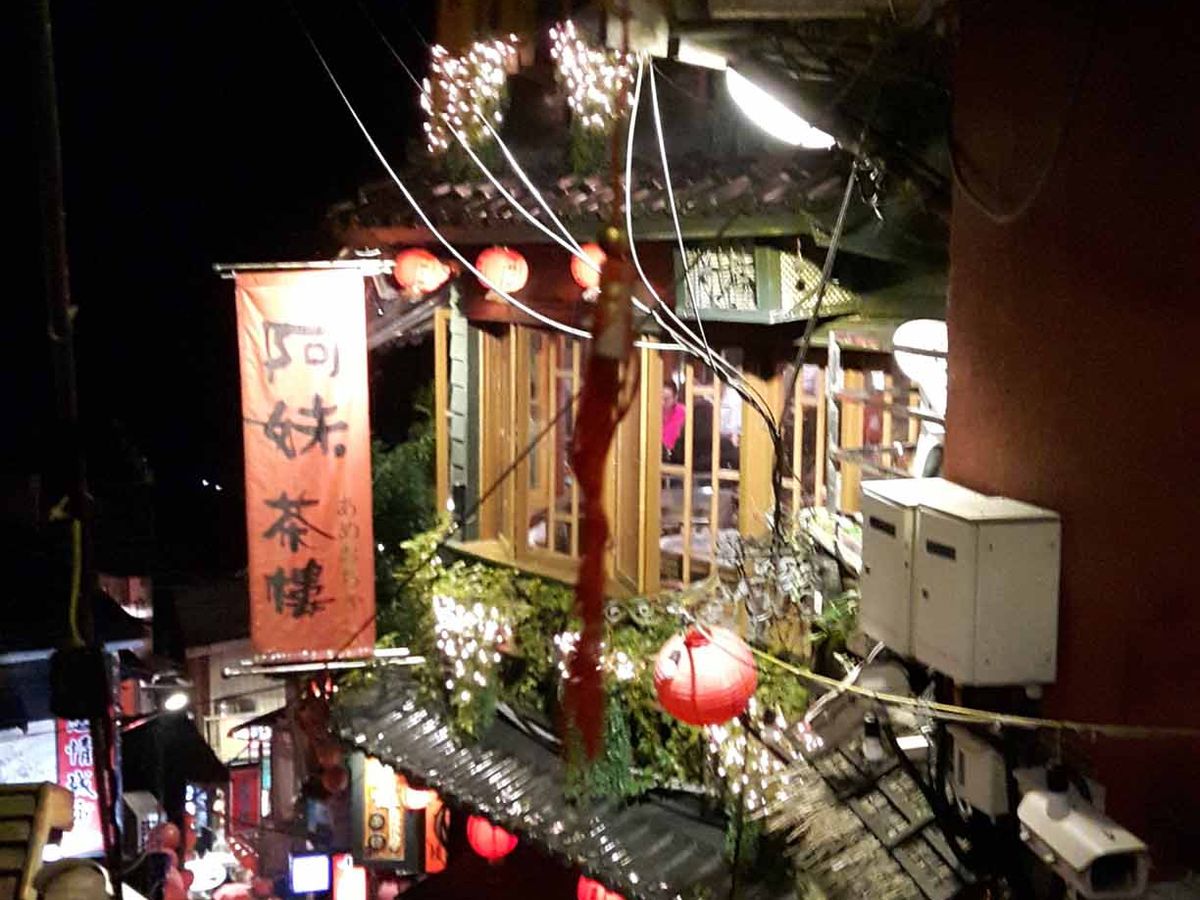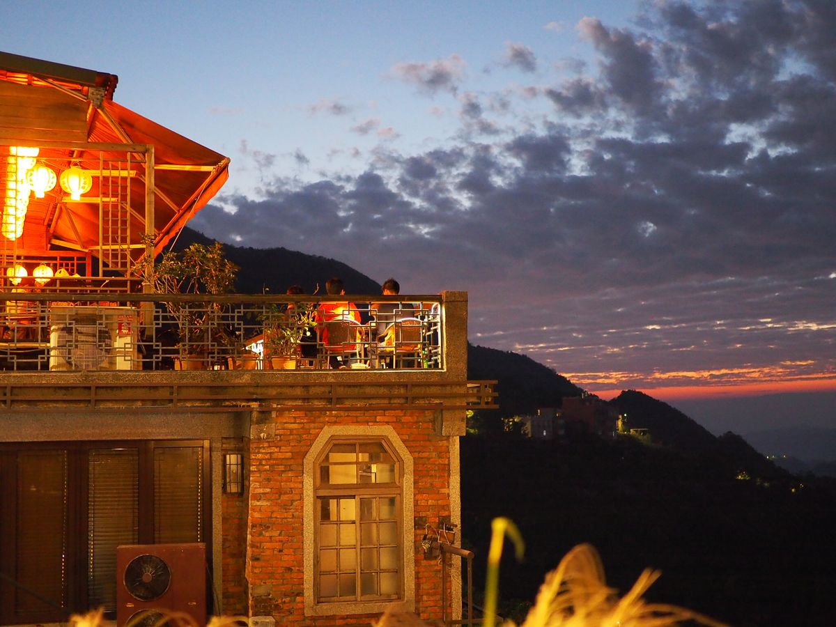 16時ごろに現地につき17時過ぎに日の入りでした。阿柑九分芋圓で日暮れ前の風景を眺め、商店街で食べ歩きをの後に、海悦楼茶房でお茶を飲みました。ここは阿妹茶楼の正面にあり最高のシチュエーションです。すこし上がった所にある店舗の入り口付近が、撮影ベストショットのポイントですが、手前で進入規制されており、入れないようにされていました。店内人入ることで素晴らしい光景を存分に見ることができました。店員さんは日本語が通じないし理解しようとしないので、事前に中国語で「テラス席でお茶を飲みたい」旨の文章を書いておいて、みせるとスムーズに入店できるかもしてません。