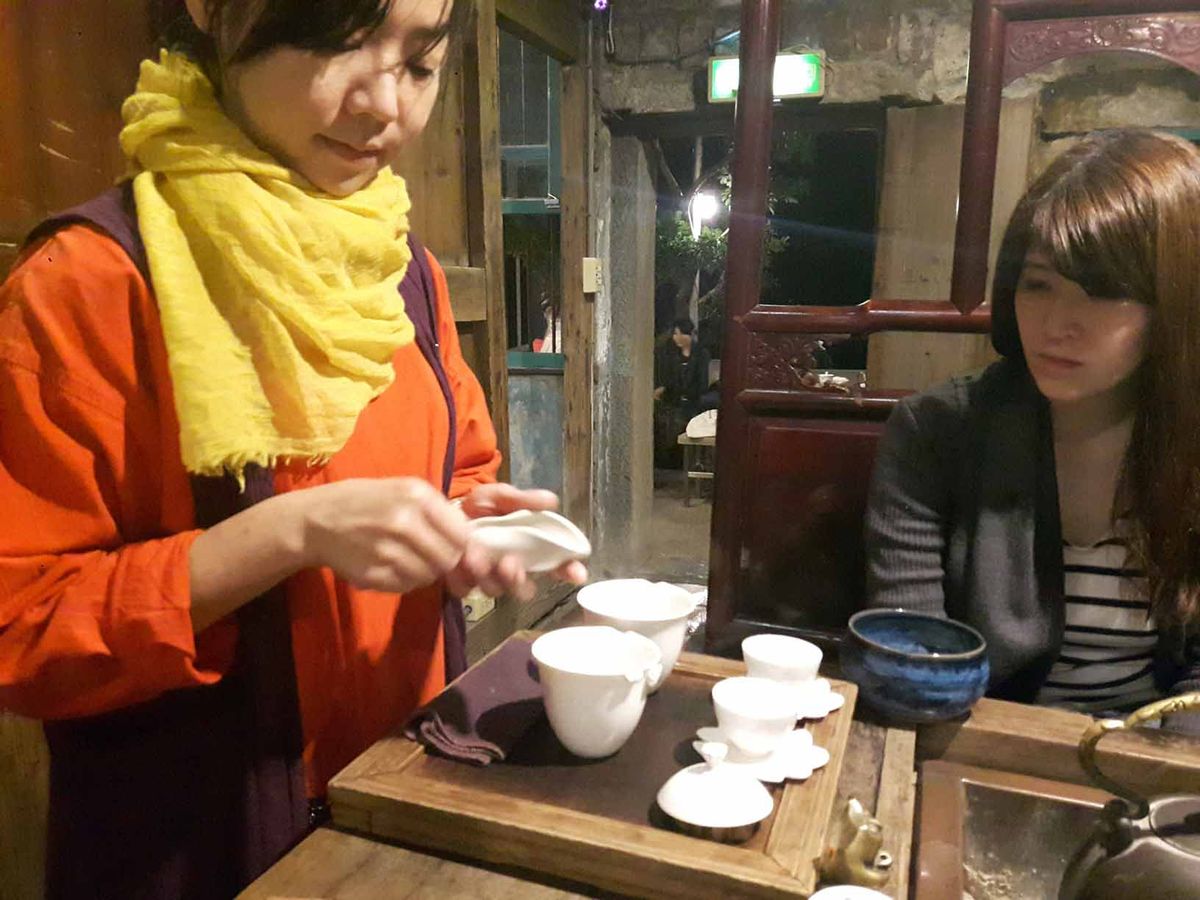 心配した雨もこの時はほとんど降らず、人手も立ち往生するほどでもなく、種々雑多なお店ウオッチを存分に楽しみました。林君おすすめのレトロな九分茶屋では、お茶の入れ方をお店のかわいい女性に教えてもらい、パイナップルケーキとともに香り高い烏龍茶を何煎も楽しむゆとりもありました。