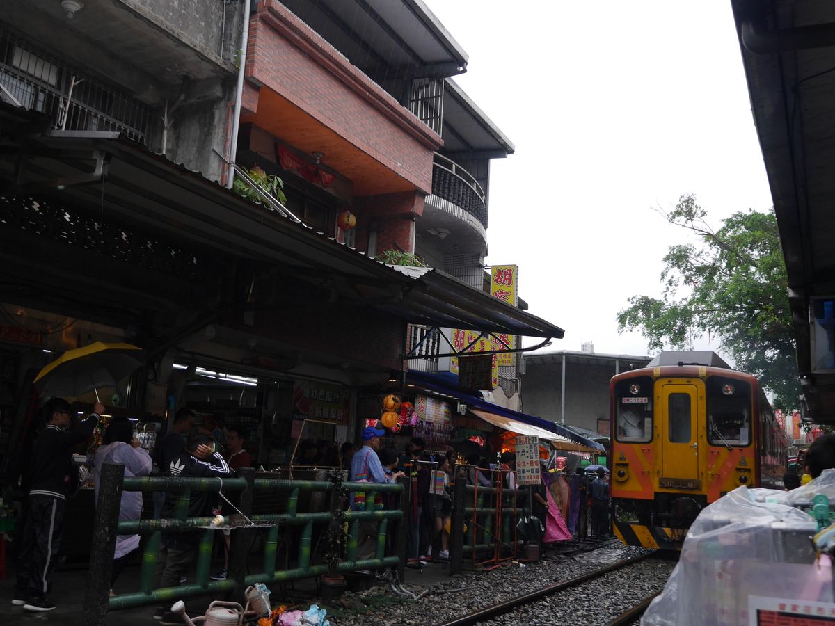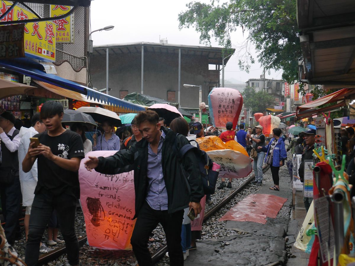 十分駅の線路の両側に商店が並んでいて、人が通るすぐそばを列車が走り抜ける光景は一見の価値があります。その線路のわきで、ランタンの四面にぎっしり願いを書いて、空にあげました。