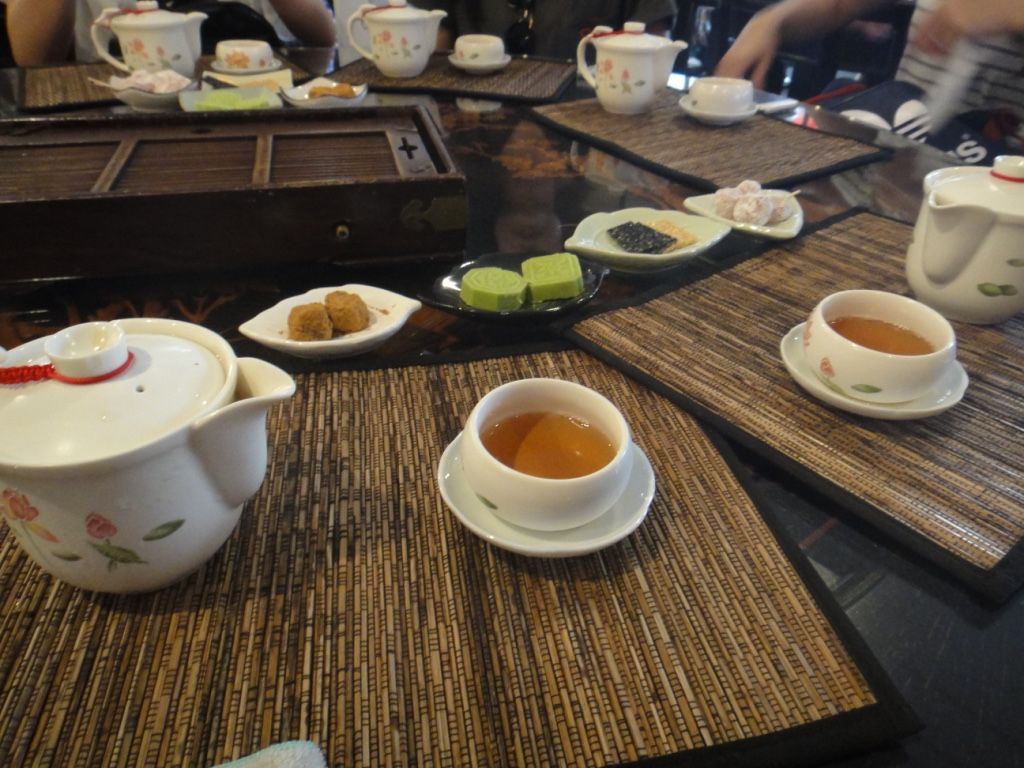 5年前に6日間で台湾を一周するツアーの時に九份に行って以来、2回目の九份でした。同行した主人と娘は初めてでした。5年前の時は街並みも楽しんだけれど、日没直後の夕焼けがいちばん印象に残っていました。家族にもそれを見せたくて、夕方のツアーに参加しましたが、前回は8月、今回は9月、日没時間の違いもあり、九份に着いてすぐに軽食を食べて、その後自由散策というこのプランでは残念ながら食事を早めに切り上げて展望スポットに向かいましたが間に合いませんでした。自由散策時間もちょっと短いと感じました。とは言うものの、バス駐車場まで戻る時間を意識しながら…芋餅を食べ、阿妹茶酒館でお茶もしっかり楽しみました。
