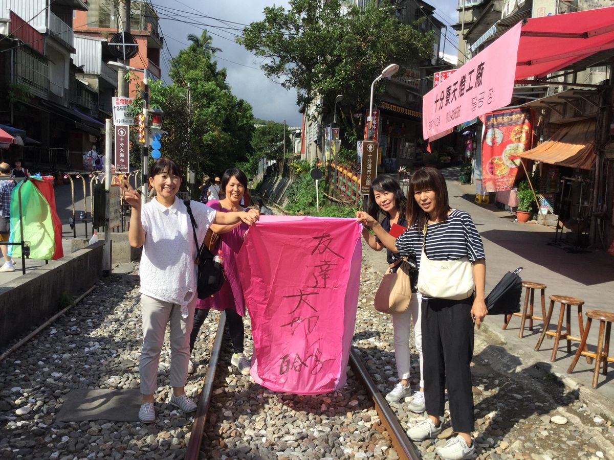 今回はお友達が出産のため3人旅。台北市内から1時間くらいで十份に到着。1時間くらい滞在して天灯上げを楽しみました。願いごとを書いて上げるまでには混雑していることもあり、少し時間がかかります。その間、電車が通るのでぜひ写真に納めてください!
