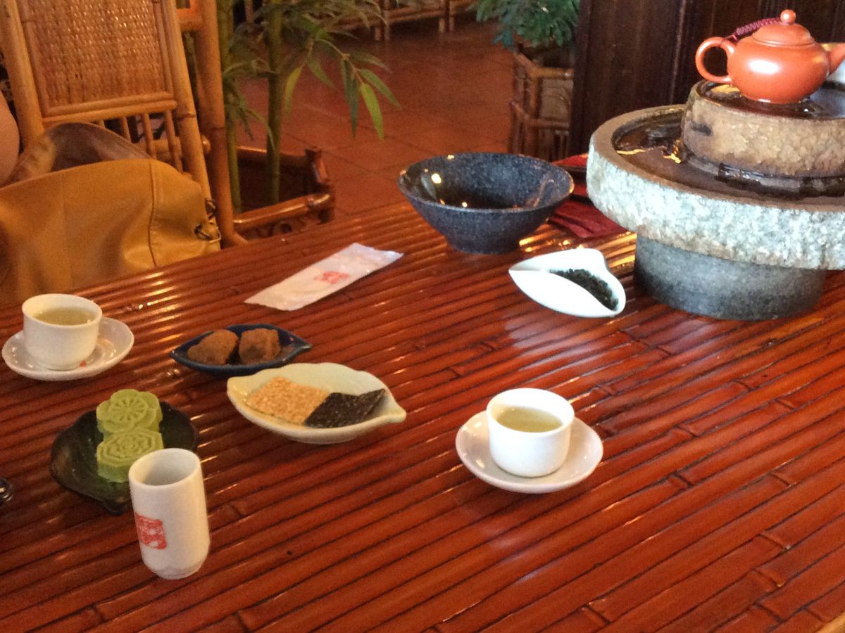 阿妹茶樓は300元でお茶とお菓子がついています。湯のみは小さいですが1回の茶葉で5.6回飲めます。それが4回くらいできる茶葉の量なのでいようと思えばかなり長く居ることができます。ウーロン茶と言われ胃に負担がないか心配していましたが、意外に飲んでみるとあっさりしていて飲みやすかったです。お菓子も美味しかったです。私たちは自由時間が1時間半でしたから、茶葉二回分(だいたい30分から40分くらいかな)で3階のテラスと入り口の顔なしのお面とともに写真を撮ってお店を出ました。出る前にダメもとで余っているお茶を持って帰りたい言ったらジップロックをくれました。