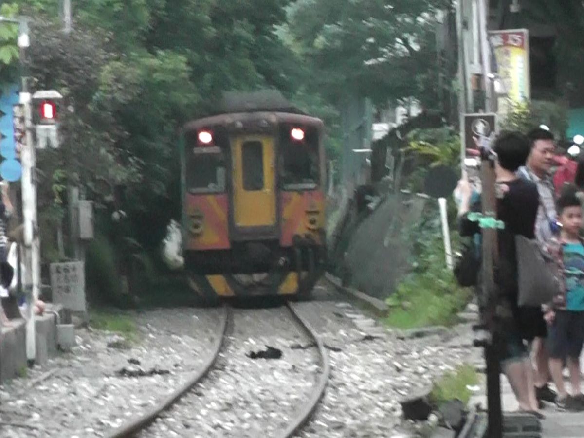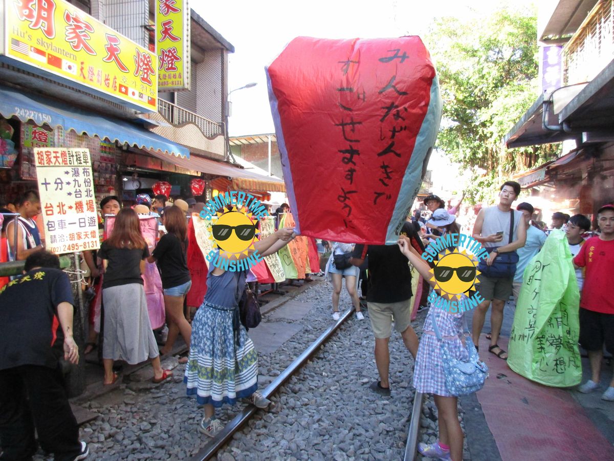 天燈上げも九份も夕暮れ時に行きたかったのですが両方は無理なので、天燈上げを明るいうちにしました。でも、天燈が青空を上っていく風景はとても素敵で、夕暮れ時でなくても十分楽しめました。観光客がいっぱいで上げるまで少々慌ただしかったですが、その後ゆっくり観光でき、電車を見たり吊り橋からみんなが上げる天燈を眺めたりできました。