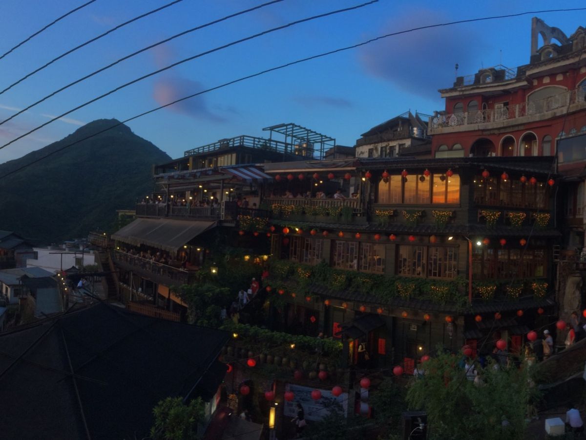 初めての台湾なので、自分では行きにくいと聞いた九份はツアーに参加しました。夜プランで日暮れ頃に九份に到着、夕焼けを見ながらお茶屋さんでお茶を飲んで、お店を出る頃には赤提灯が綺麗な時間帯になっていました。