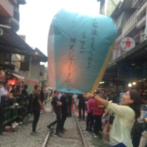 まず朝イチで、天燈上げに十份に行きました。天燈上げをしたいというのは若い女性が多く、そのほとんどが恋愛祈願です。(私達もそうでした。)他のツアーでは赤一色のようですが、今回のツアーはとても可愛いピンク色の天燈で、満足してお願い事をすることができました。