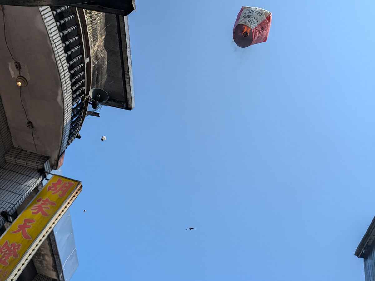 十分の天燈上げは明るい時にやり、それなりに良かったのですが明るいと天燈が落ちてくるのが見えてしまうので落ちてくるのが見えない夜の方がもっとよいのではと感じました。時間があれば夜の十分の方が良いのでは。
