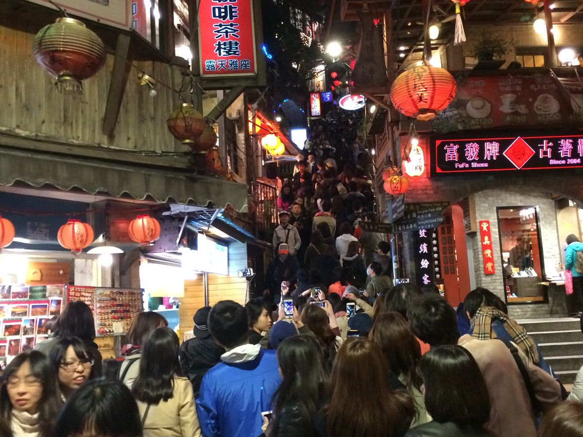 土曜日の夜18時過ぎということもあり九分はすごい人で、「阿妹茶酒館」の横階段は一歩一歩牛歩状態で登りました。その階段をどこかのツアーの添乗員は「付いてきてくださいね~~~」とずんずん登って行き、ひんしゅくでした。お年寄り、子供も足元が見えないのであきらめて引き返す人も。一時の混みなんでしょうが、関係者の方が誘導するなり、時間で一方通行にしないと今にけがをする人が出ると思います。また、ツアーの軽食は試食レベルです。