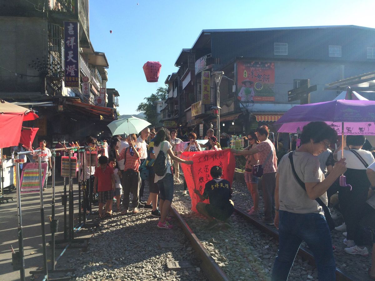 十份では明るいうちから天燈上げをしている人がたっくさん。しかも線路の上で。。電車が来る音が鳴るとみんなで灯籠を移動させているのが印象的でした。とりあえず瀑布に向かったのですが、道を間違えたのか、ただただ遠い。滝見て帰ったらすでに集合時間で結局天燈上げは出来ず終いでした。。
