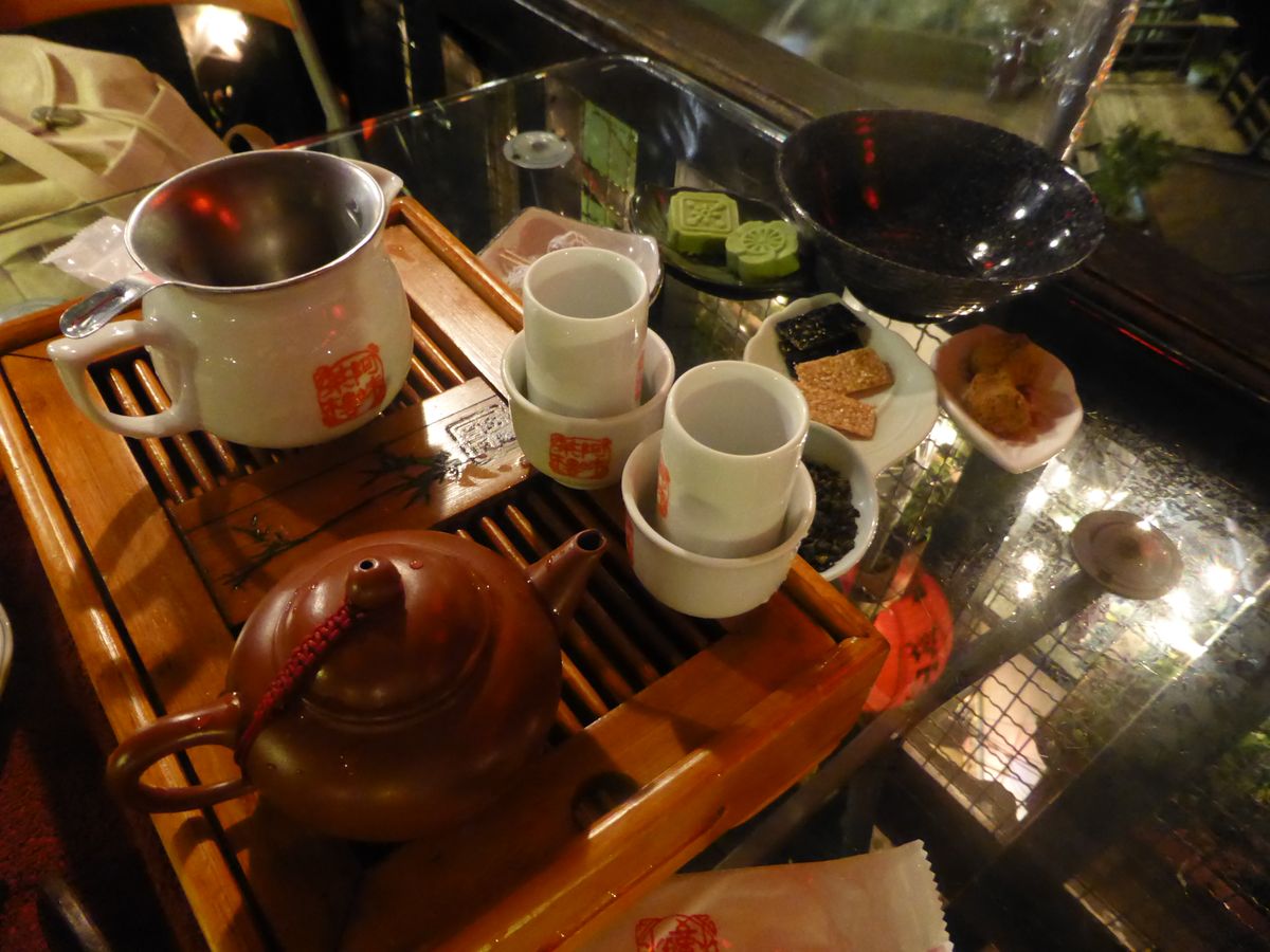 自由時間は2時間たっぷり!ガイドさんがおすすめしてくれたお店で芋団子を食べたり、草餅を食べたり、あま~いマンゴージュースでのどを潤したり、とにかくいろいろと食べる食べる。そして、あのお茶屋さんへ!もちろんお茶も茶菓子もおいしかったんだけど、モデルとなったお見せるにいることがとにかく感動!幻想的なお茶屋さんでホッと一休み。