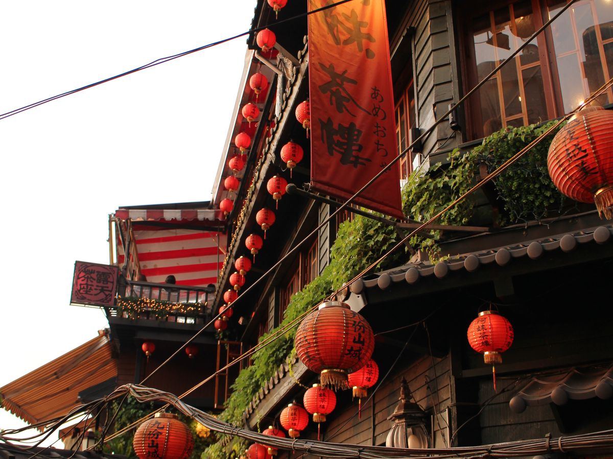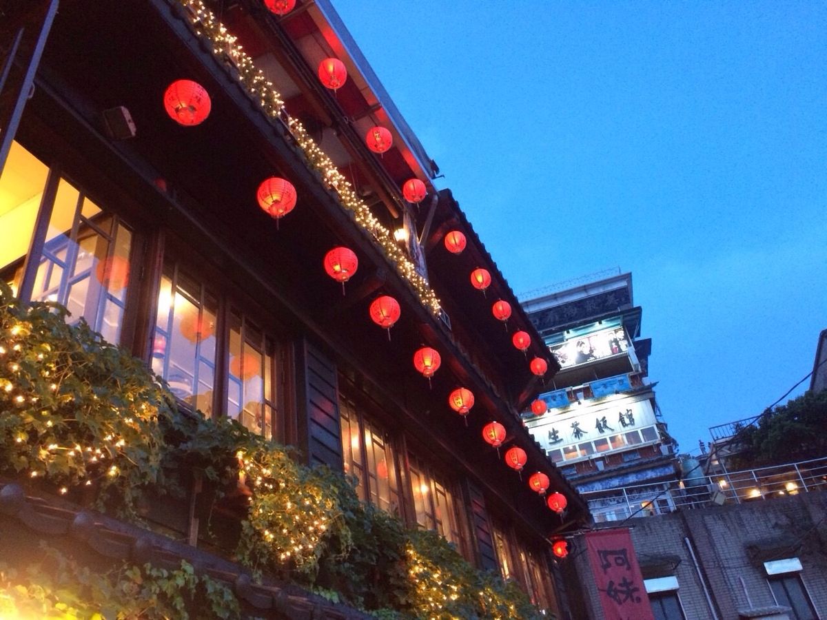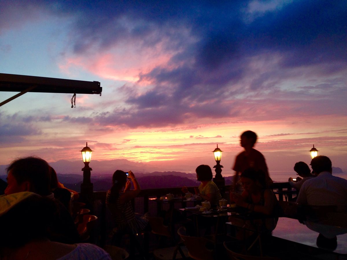 夕暮れの九份でお茶を飲みながら隣の席の外国人観光客とのおしゃべりを楽しみ、