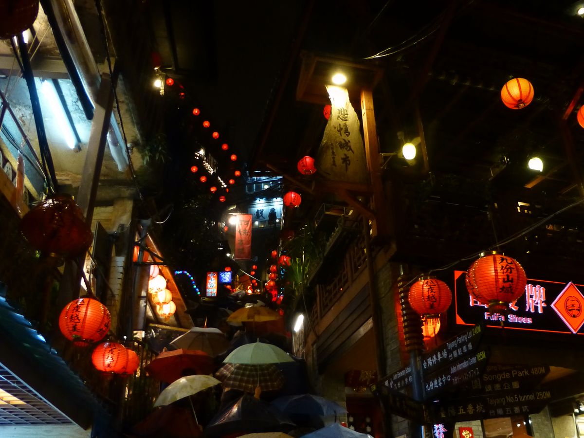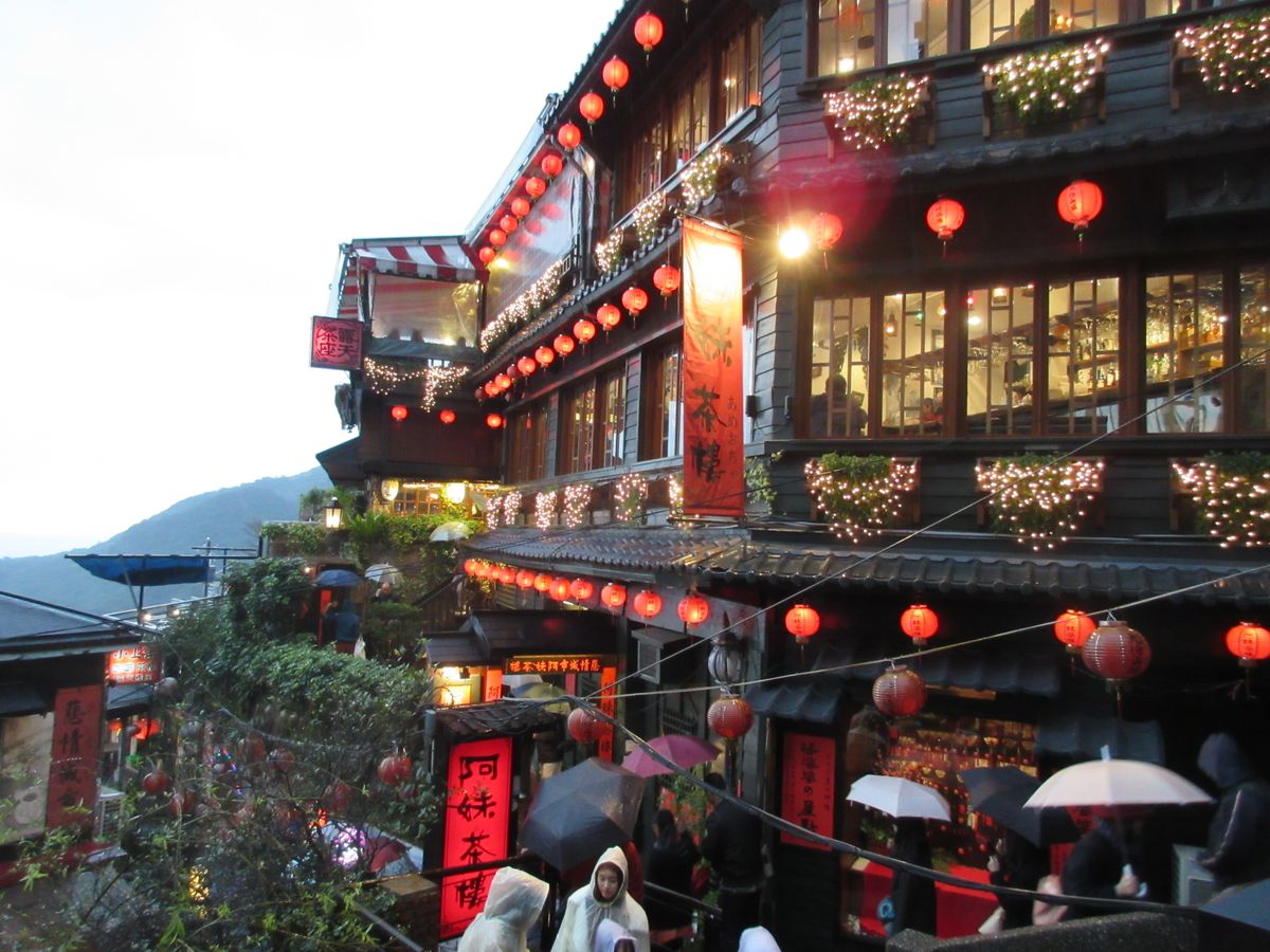 昼間と日が落ちて灯りがともる時間と両方見たかったので午後のツアーに参加しました。週末はとても混むと聞いていたので月曜日にしましたが、すごく混んでいて驚きました。ただ歩けないほどではなかったです。ガイドさんが、お店が並ぶ通りで草餅などおすすめのお店を教えてくれました。雨が多いところのようで、着いたとたんに雨が降り始めました。気温も標高が台北より高いので寒いです。雨具と防寒(冬)は必須です。自由時間がたっぷりあったので、有名な茶楼でゆっくりお茶をすることができました。自力だととても不便なところなので、ツアーにしてよかったです。