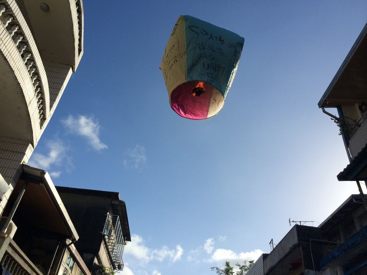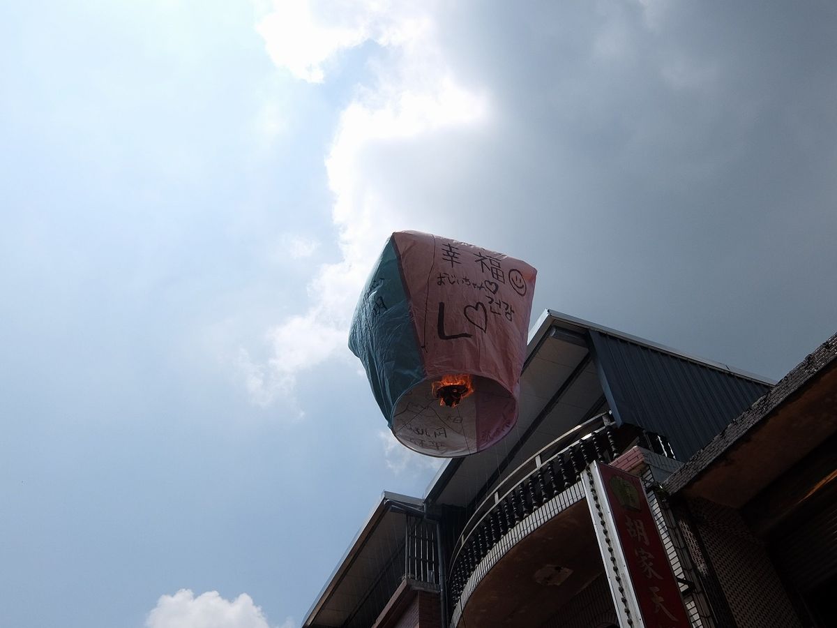 十分では点燈上げの間一緒にいてくれて、やり方、写真撮影、1時間に1本の電車のことなどいろいろ教えてくれて、願い事をいっぱい書かれた天燈は天高く上っていき大成功。