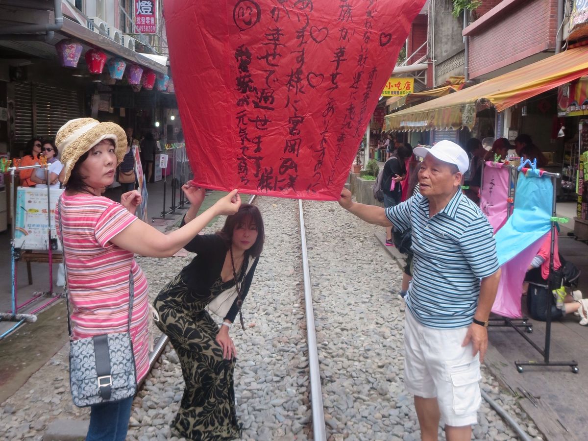 その後、天燈上げを急かされながら、やります。次々とツアー客が到着し、ゆっくりとやる雰囲気ではなかったです。でも、面白かった!