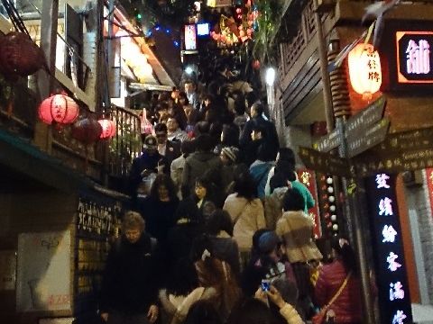 九份:以前利用した午前のツアーでは商店街の入り口までバスで行けたのに今回は離れた所にあるバス専用駐車場から歩いて更に阿昧茶楼のある階段の一番下から登ったのでかなり疲れた。日本の連休(当日はこのツアーのバスだけで15台あったらしい)かつ台湾の土曜日だったので初詣並に混んでいた。階段を登り切るのに30分以上かかった。後で分かったが脇道から行けばすぐだった。
