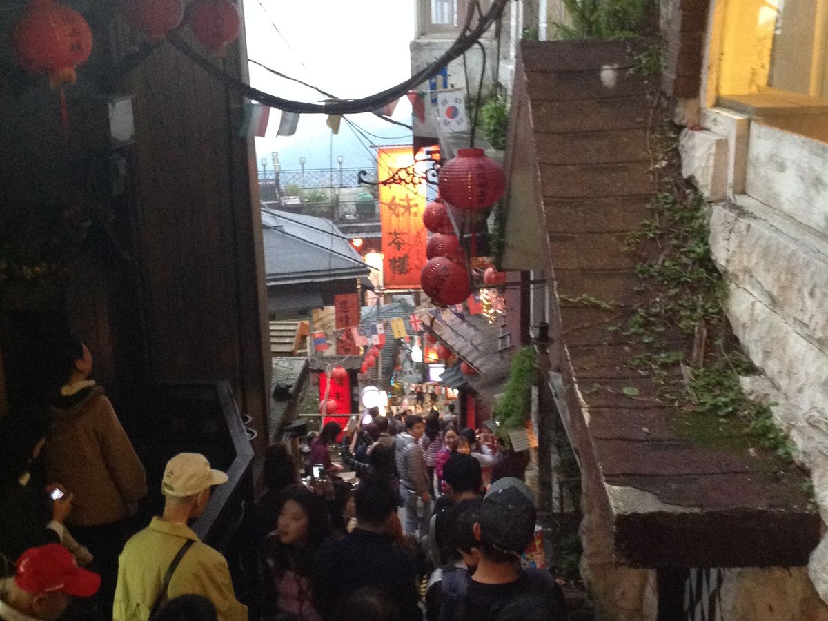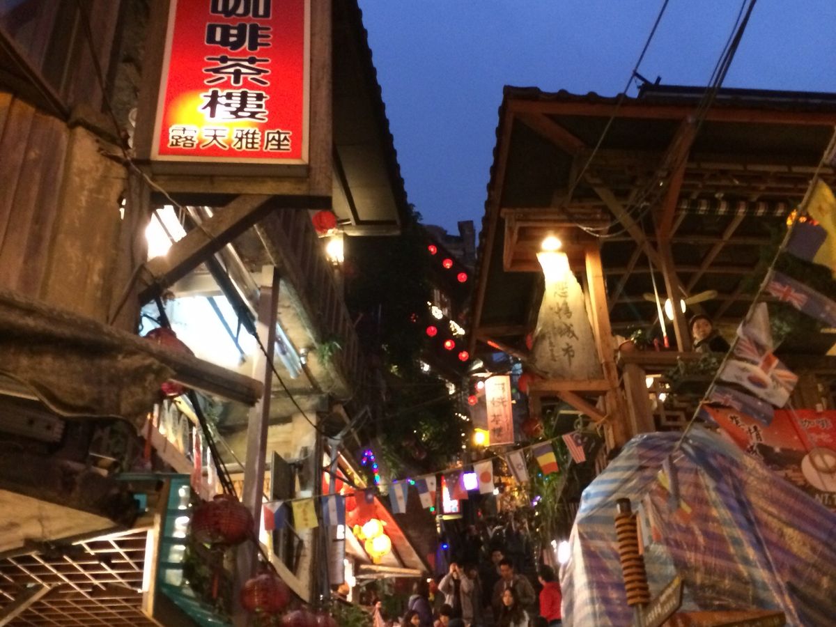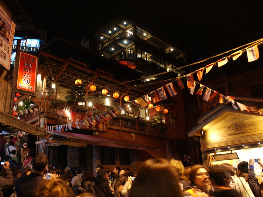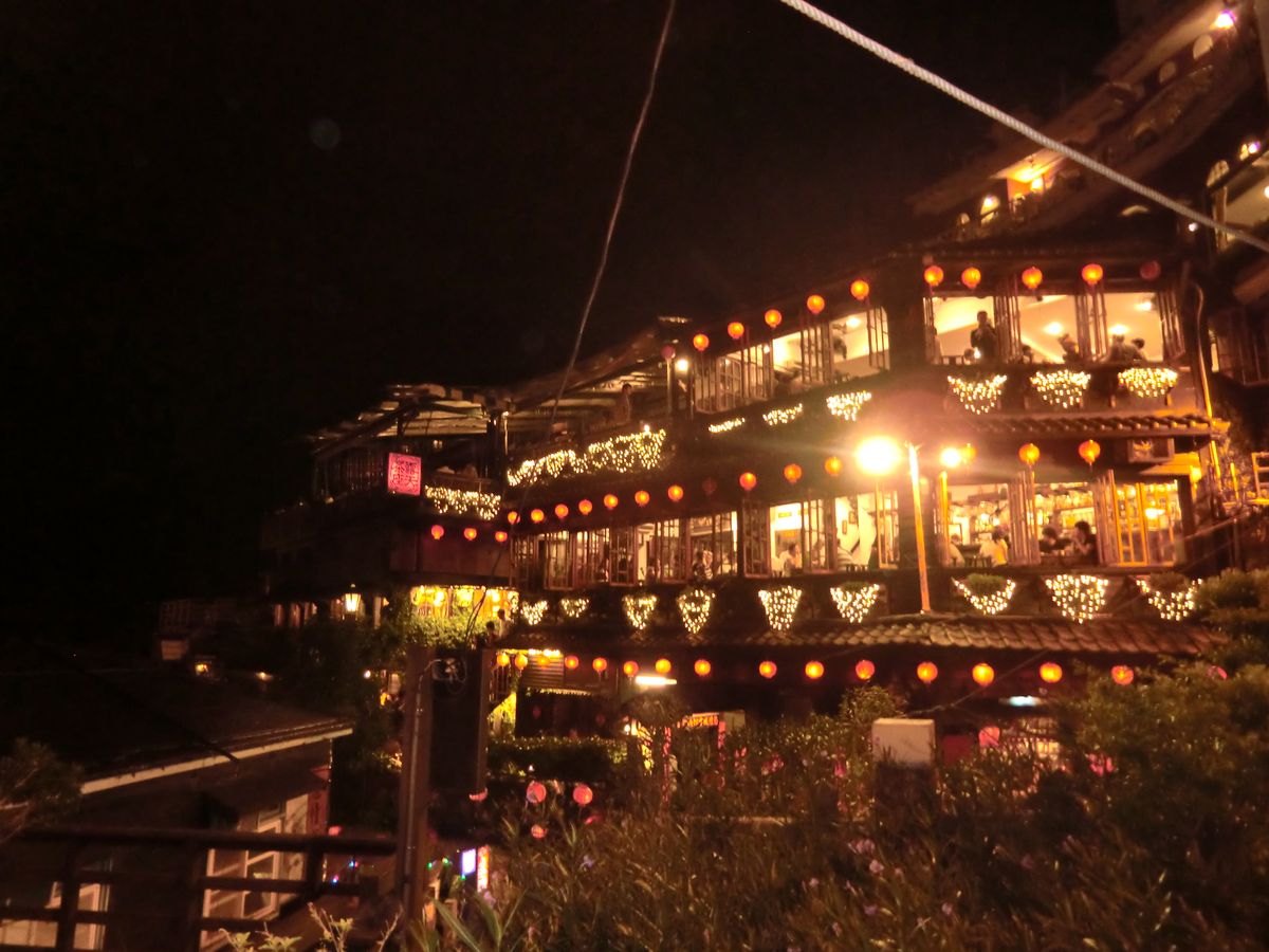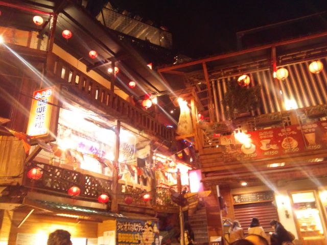 夜の九ふんは一人で行ったらバスがなくなる恐れがあると聞き、ツアーで行く事にしました。受付は若干効率が悪いが、ガイドさんはグッドでした。九ふんは1年のうち3分の2が雨だというので行ってみたら、案の定雨でした。こればかりは仕方がないです。街はノスタルジックな雰囲気で素晴らしいけど、夜の九ふんは人でごった返していて、名所の階段で人とすれ違うのも、なかなか先に進めなかったりなど大変でした(観光客は日本人ばかり!)。ツアーに付属している軽食はおいしかったです。