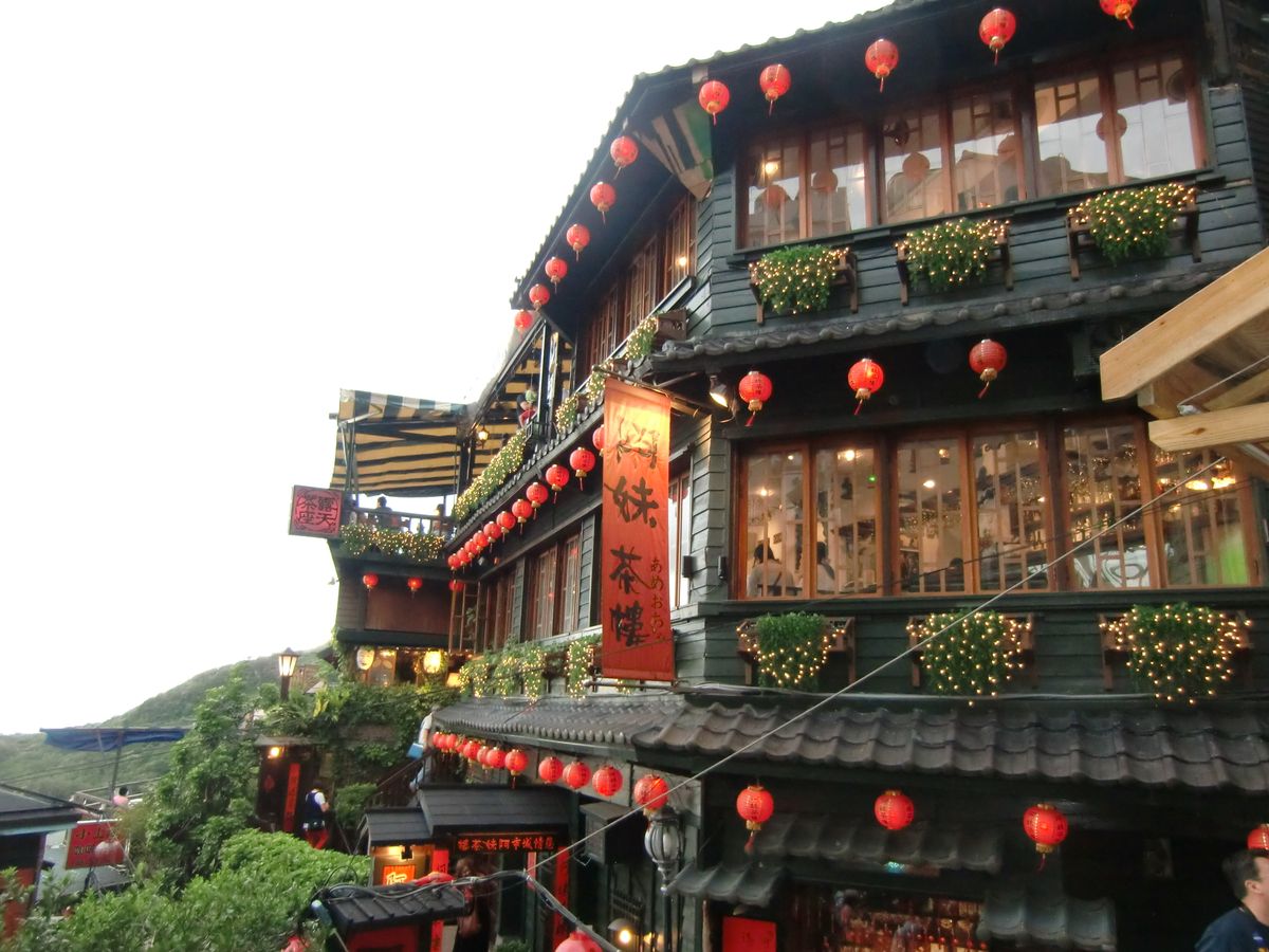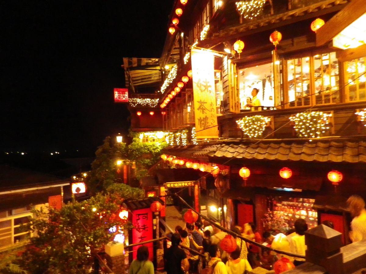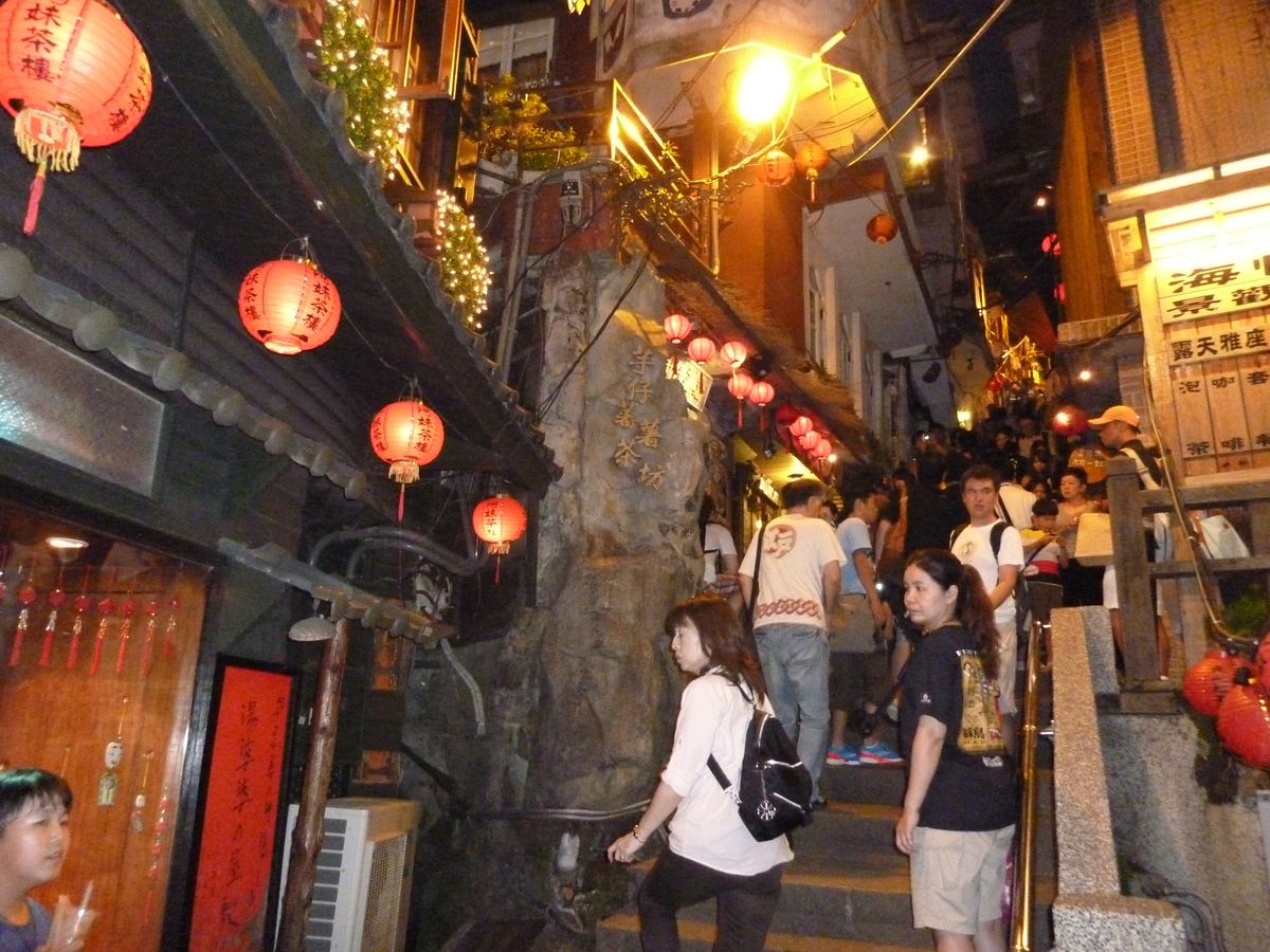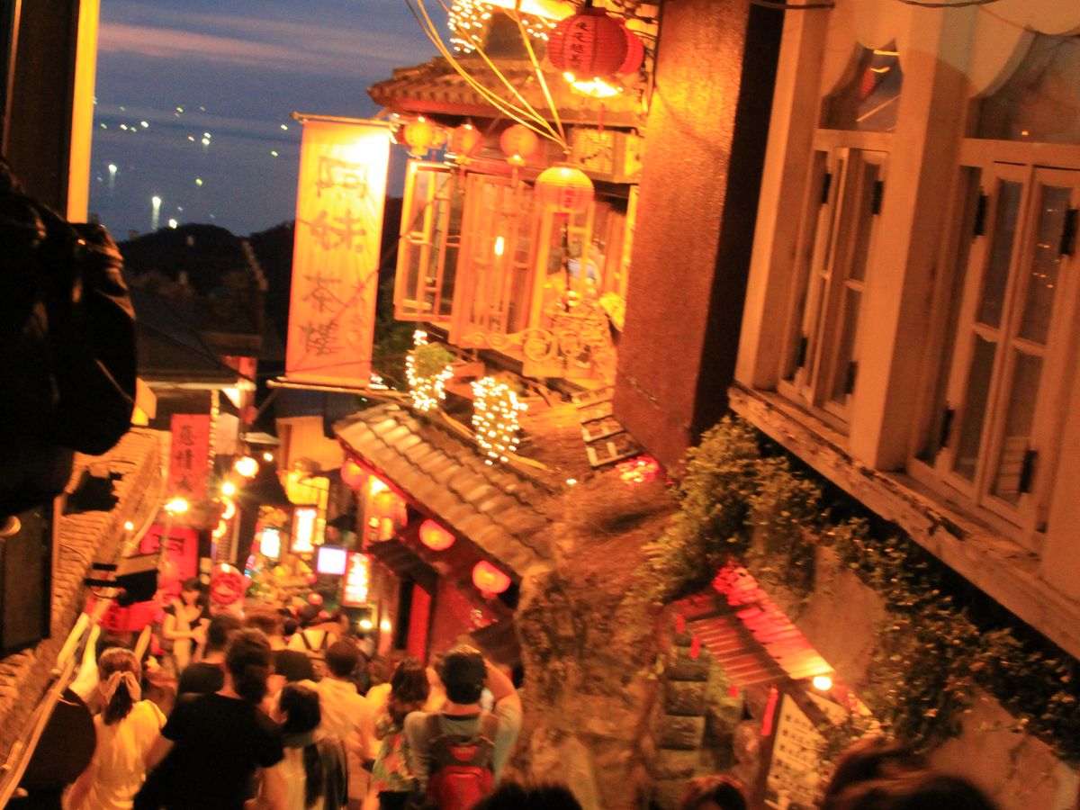 夏の台湾、九份は台北より雨が多いと聞いてスコールとか心配でしたが、到着前にやんでくれました。海沿いなので台北より爽やかで、夕暮れの風も気持ち良ったです。紅い提灯に照らされた建物はガイドブック通りでした。しかし階段は手摺りがなく、角度も急で予想以上にキツかった。午前中から観光にショッピングに、でバテ気味の方には辛いかも…お店は台北市内の露店と変わらない印象でした。滞在時間は1時間くらいなのでツアーについている軽食後に、無理せずレストランの眺めの良い席でのんびり一杯もいいかも。