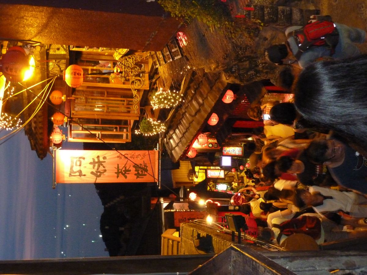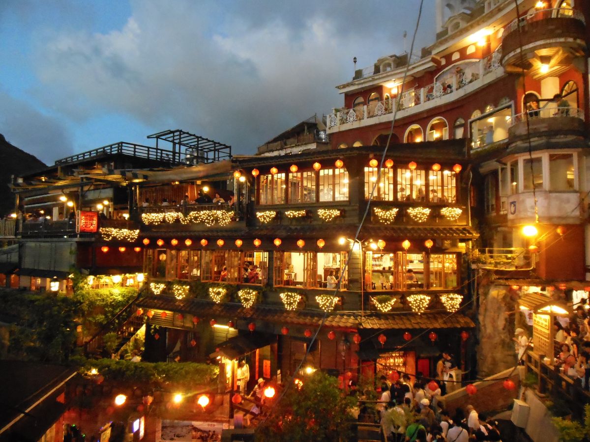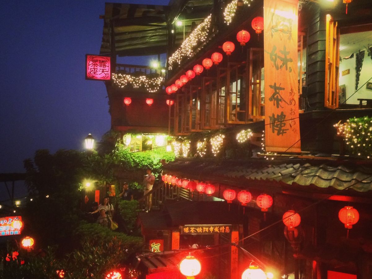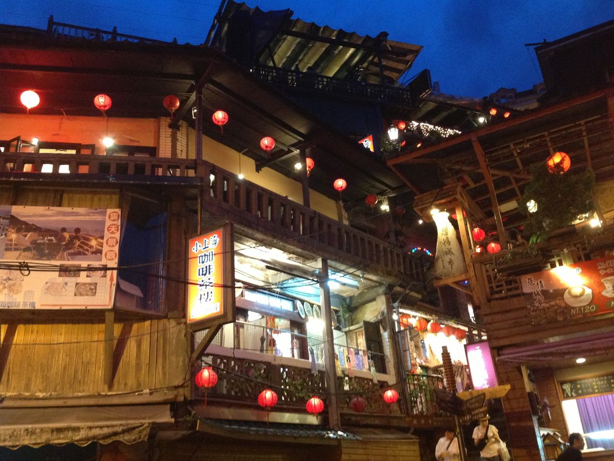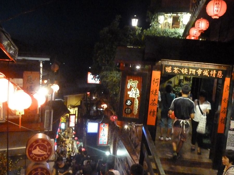 夏の台湾、九份は台北より雨が多いと聞いてスコールとか心配でしたが、到着前にやんでくれました。海沿いなので台北より爽やかで、夕暮れの風も気持ち良ったです。紅い提灯に照らされた建物はガイドブック通りでした。しかし階段は手摺りがなく、角度も急で予想以上にキツかった。午前中から観光にショッピングに、でバテ気味の方には辛いかも…お店は台北市内の露店と変わらない印象でした。滞在時間は1時間くらいなのでツアーについている軽食後に、無理せずレストランの眺めの良い席でのんびり一杯もいいかも。