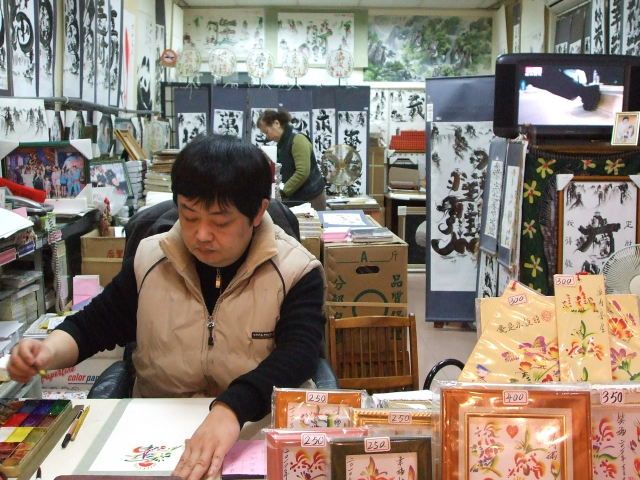 写真二枚目の文字書き屋さんは1000円以内で掛け軸に家族の名前を書いてくれます。ほんの数分でお値打ちのお土産が手に入ります。