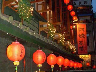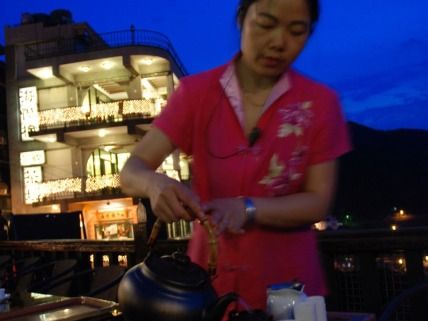 千と千尋のモデルとなった茶屋でゆっくりしましたが突然おじさんが現れてお茶のことをあれこれ。よく顔を見たらガイド本に載っているこの茶屋の社長さんでした。記念写真を撮って出発。展望台のそばにある文字を絵にするおばさんの店で名前を絵文字にしてもらいました。ここはお勧め。間違いなくこの店はTVで紹介されることになるでしょう。孫の名前などを絵文字にしてお土産にすると最高でしょう。小さい掛け軸にして500元です。 できればここは昼夜見ていただきたい。(晴れていることが一番の条件です。)