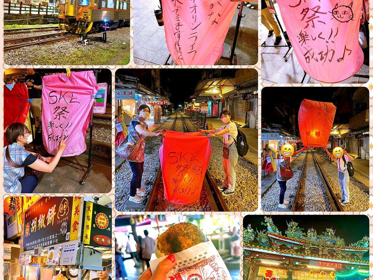 九份から十分に移動し、台湾鉄道の線路上でランタン(天燈)飛ばし体験。色は願い事で別れててピンクは幸福。4面あるため、相棒と2面ずつ願い事をしたためました。 思ったより大きくて、空高く飛んでいって楽しかったです。お店の方が動画や写真も撮ってくださいました。