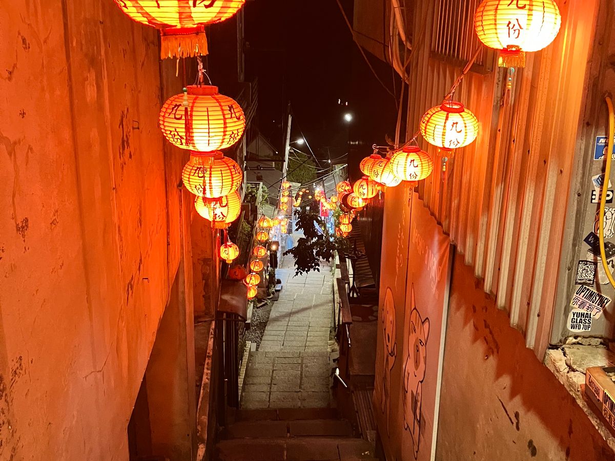 店を出た頃にはちょうど夕映えが綺麗な時間帯で、九份らしい街並みを楽しめました。さらに少し食べ歩きをして階段を降り始める頃には、土曜でもあったせいかすごい混雑で、早めに出たつもりが列が進まず少し焦りました。