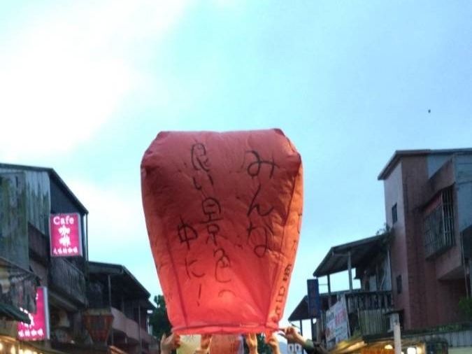 十分では希望の夜の天燈上げを体験できお土産までいただいて
