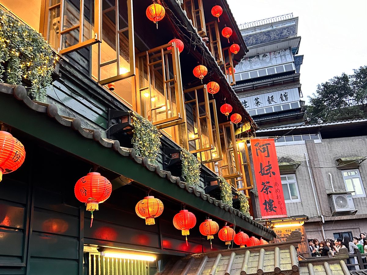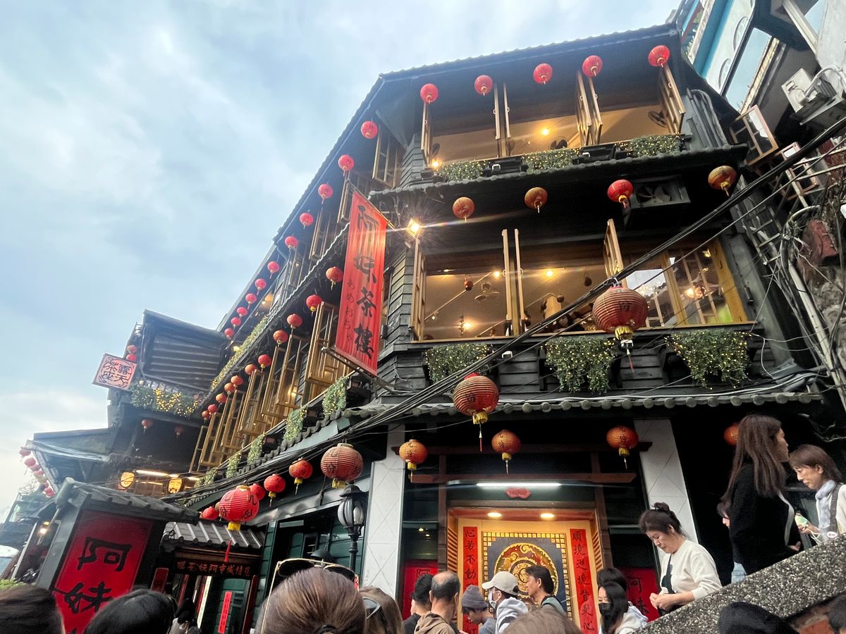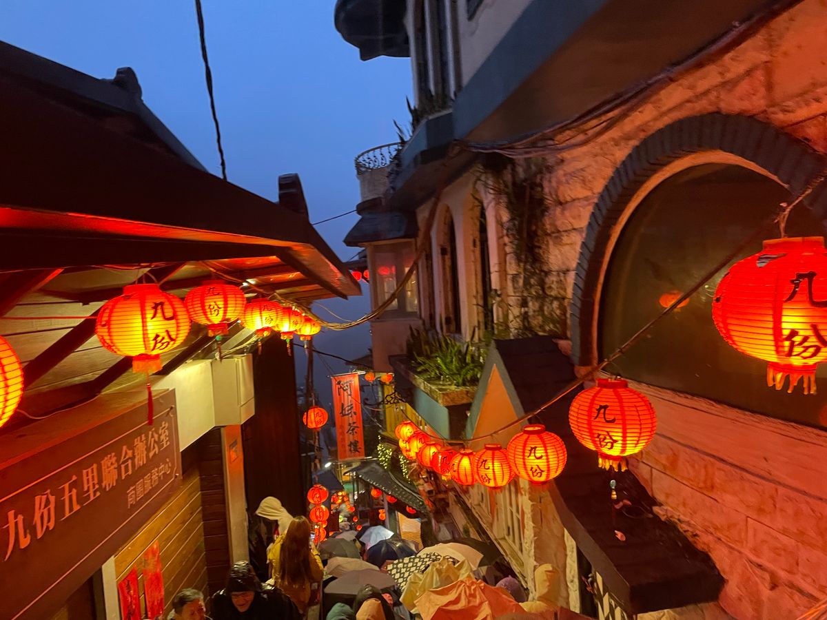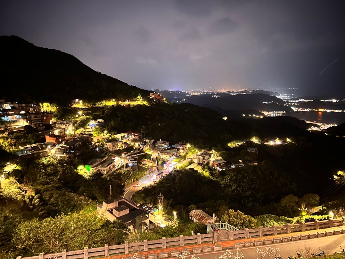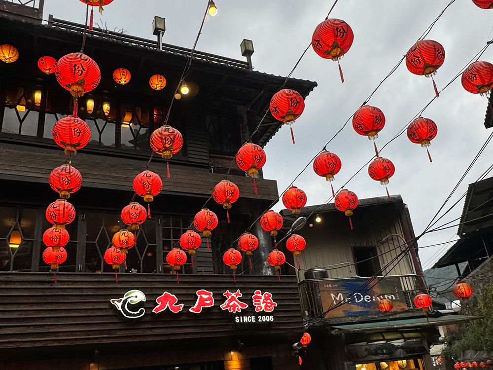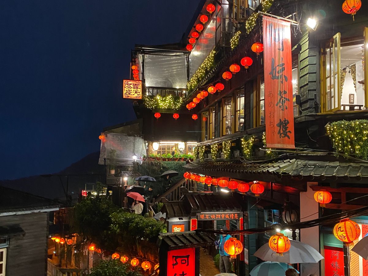 九份は時間が遅かったことと雨のおかげで混雑がなく、お茶屋さんにも待たずに入れたことは非常に満足。でも、テラス席はビニールシートで覆われていましたし、海の景色は真っ暗で見えませんでしたよ。
