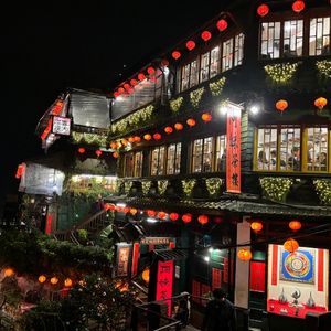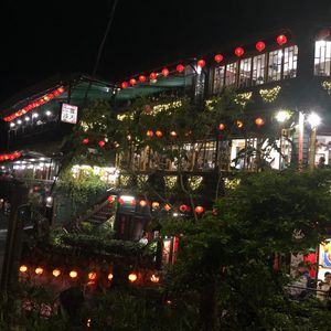 夕方、ライトアップされた 赤い提灯、阿妹茶