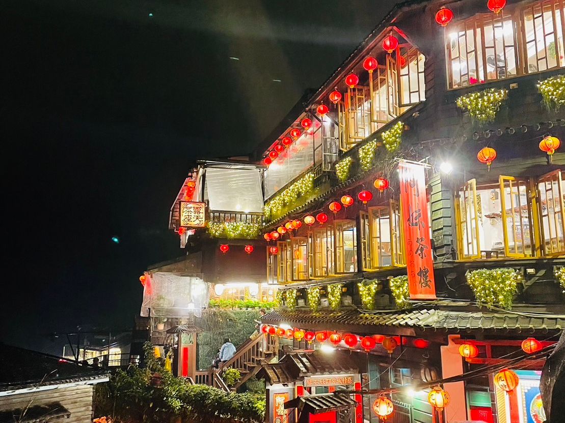 【九份】山道で階段だらけと聞いていましたが、運よく駐車場が空いていたからか阿妹茶楼前の階段以外はなだらかな道でした。九份茶坊まで俊さんが案内してくれて道中、景色の良い場所で写真を撮ったりお茶の試飲やパイナップルケーキの試食をさせてもらえて楽しみながら移動できました。まだ明るい時間だったので混雑なく阿妹茶楼の写真もたくさん撮れました。九份茶坊は阿妹茶楼を見下ろすテラス席に案内され、喧噪から離れた贅沢な空間でゆっくりお茶を飲みながら黄昏時の九份の景色を堪能できて幸せでした。お店の方がお茶の淹れ方を日本語で丁寧に説明してくれて、お茶菓子はどれも美味しく、お湯の差し替えも頻繁にしてもらえました。また、お手洗いはペーパーも備え付けられていて綺麗でした。その後も1時間以上食べ歩きをしながら街歩きをする時間もありました。さすがに暗くなってからの阿妹茶楼前は大混雑で少し恐怖を覚えましたが、それ以外の場所は賑わいはありつつも歩行に支障はない感じでした。