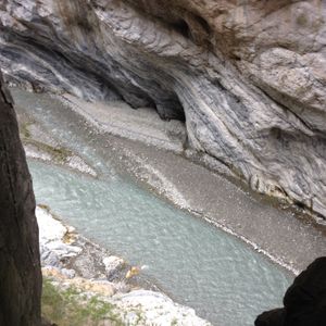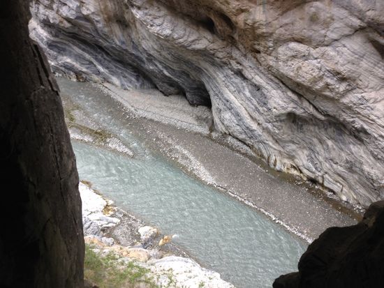 70代の両親と、8歳の息子、私の4人で参加しました。ヘルメットをかぶって歩く渓谷沿いの道は歩きやすい道なので、高齢者にも子供にも問題なかったです。(ただ、70代の両親にとっては、けっこう歩いて疲れた~という感じでしたが。)渓谷沿いの大理石もようがはっきり見られ、これがず~っと続いている様子に驚きました。川の水が少なく、きれいな色ではなかったのですが、渓谷美を楽しむことができました。バスで渓谷へ入っていく際、「落石は大丈夫かな~」と心配になり、心の中でスリルを味わいました。もちろん、落石などはまったくありませんでした。
