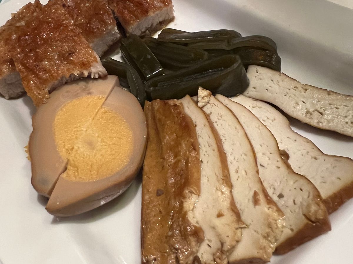 白菜は薄味でホタテ餡をつけてもちょっと物足りないくらい。角煮肉は八角の味がほんのりします。私はあまり得意ではありませんが、そこまできつくないので美味しく食べられました。