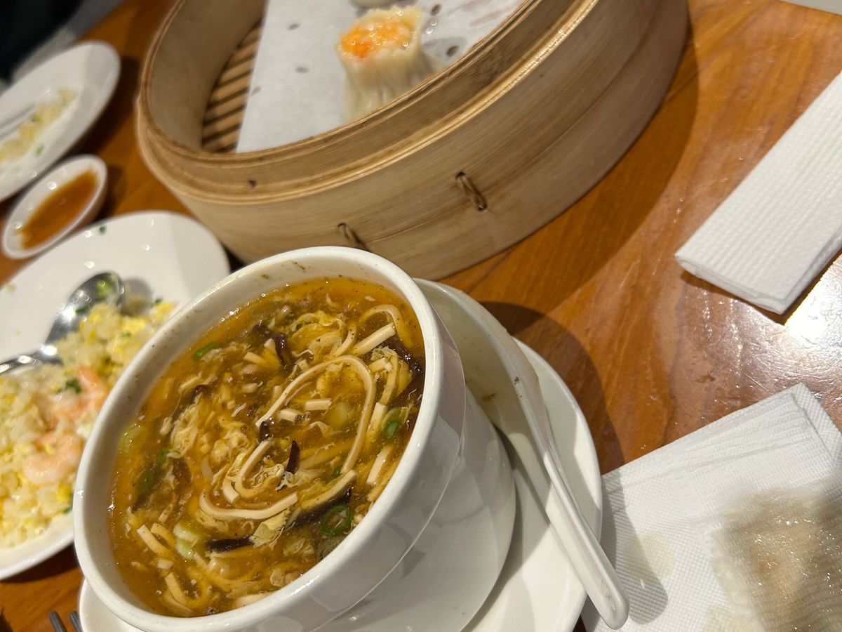 入店後はほぼ同時に小籠包3種類と青菜、酸辣湯、肉チャーハンが提供され、テーブルのスペースに空きがなくなりました。(2人席は狭いです。)