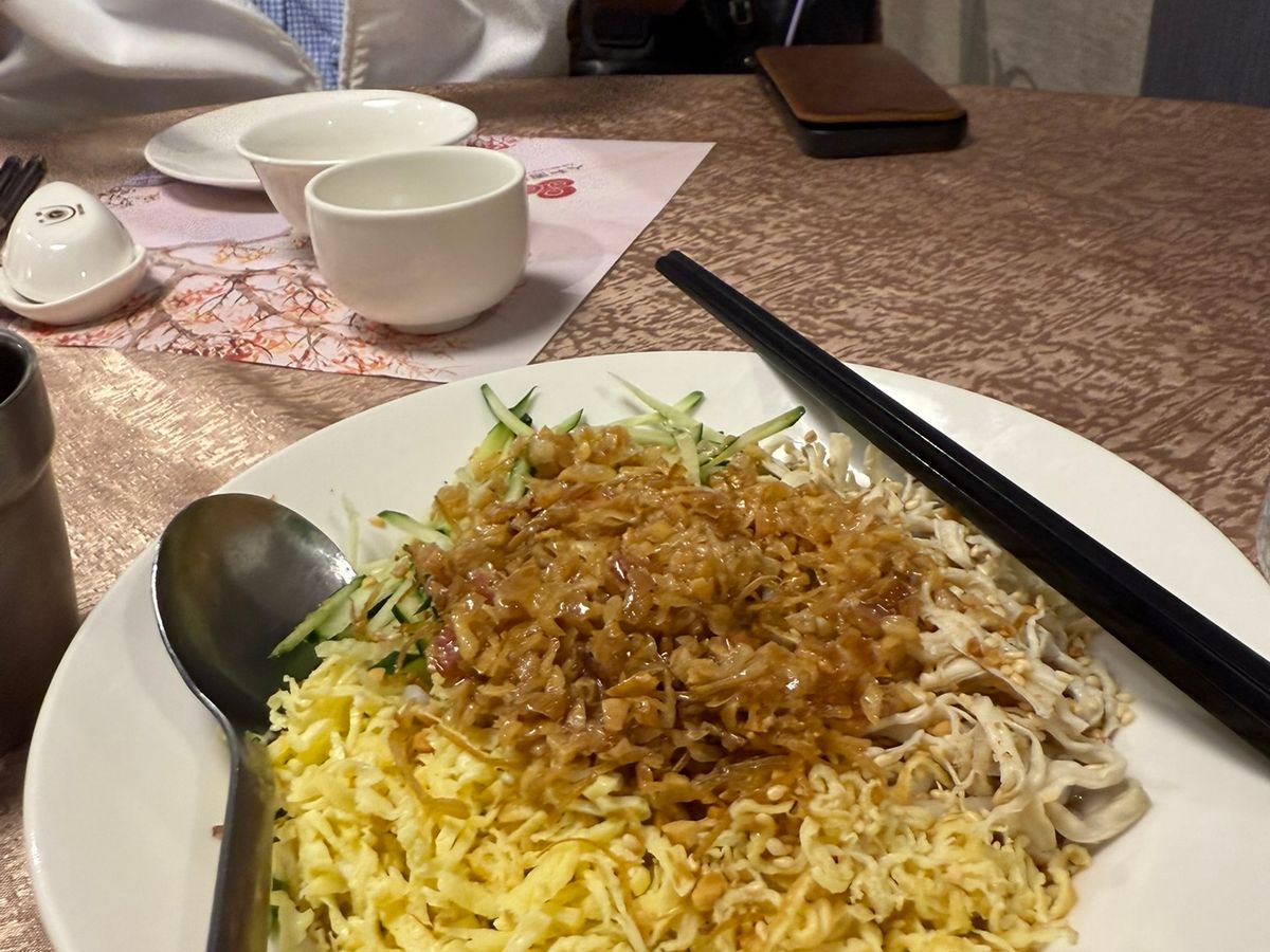 米粉麺の上には細かく裂いた鶏肉、錦糸卵、キュウリなどを混ぜ合わせて頂きます、