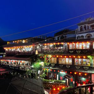 九份でも阿妹茶樓の向かいの海悅樓景觀茶坊を19:00から予約している旨を話したら知り合いだから17:45から入れていただき、テラス席までご用意してくれ夕暮れから夜まで素晴らしい写真時間を与えてくれました!