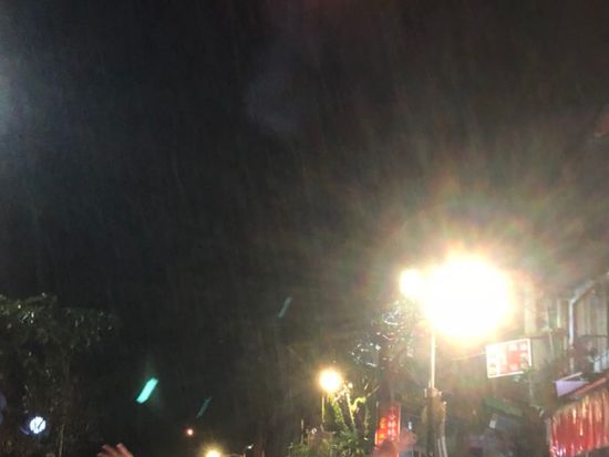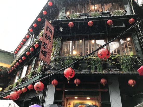 駐車場の場所を確認後、そこでは下車せず九份の入口(よくガイドブックにも書いてあるセブンイレブンの横の入口)まで送ってくださり、そこで下車。約2時間観光しました。夕方でしたので食事はせず、カフェ(非情城市)で中国茶とケーキで休憩しました。この時ちょうど、上述の通り十分ランタン上げの写真・動画をDavidさんが送ってくださり、家族3人でその速さに驚き&感動しつつ、お茶を飲みながら鑑賞しました。そんなことをしているうちに、さっきまで曇りだったのにどんどん土砂降りになってしまい……(むしろ十分では晴れていました)。待ち合わせの駐車場までは何とか到着できたものの、如何せん雨がすごすぎて自分のタクシーを探せるような状況でもなく、一旦駐車場の入口にある建物の屋根の下へ避難し、そこからDavidさんへ状況をLINEしたところ、3秒で返事が返ってきて、すぐにそこまでお迎えに来てくださいました!