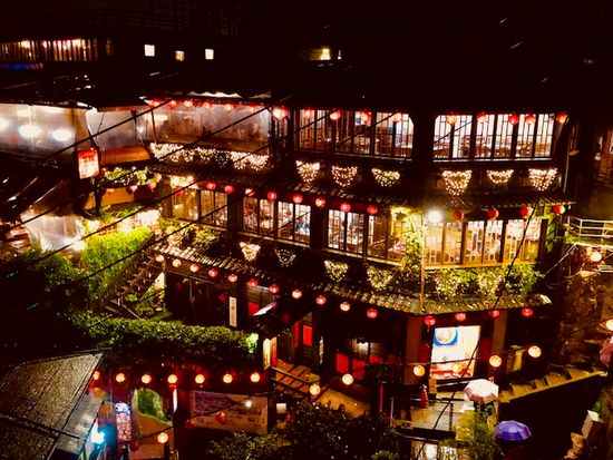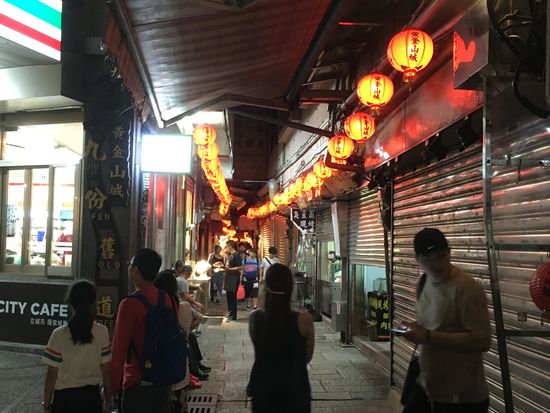 私達は九份の入り口付近で下車し、そこから2時間ほど観光しました。九份は場所によって急な階段があり、足の不自由な父は些か大変そうでした。でも時間がたっぷりあったので、疲れたらお店に入って休みながら散策できました。休憩で入った茶藝館のテラス席から眺めた夕焼けがとても美しく、心に残りました。。