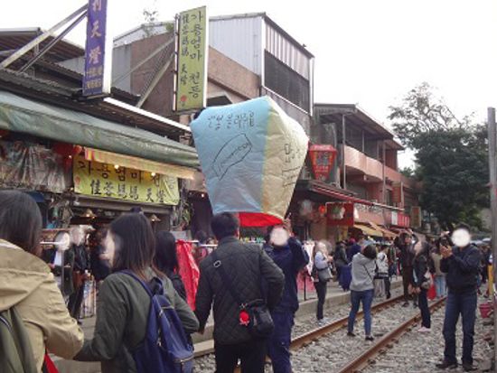 四色の天燈に筆で願いを書き入れ、線路上で火を灯して一緒に解き放つ・・・家族の共同作業がとても楽しい想い出になりました。