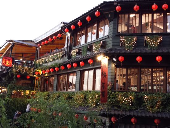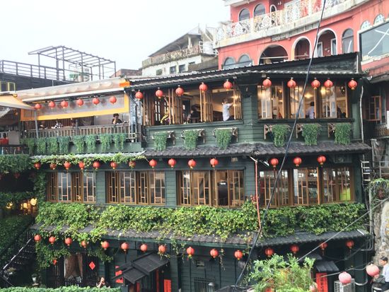 上の方の九份茶房 (日本人の奥様がオーナーの茶房です。雰囲気良いです) で、台湾式のお茶の入れ方を教えてもらいながらお茶をして、ジブリ映画で有名な? 階段沿いの街並みを見ながら下山。
