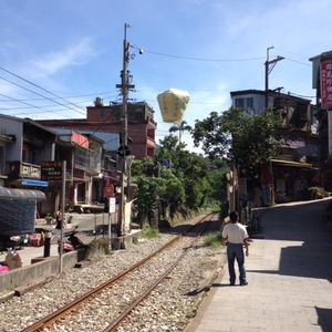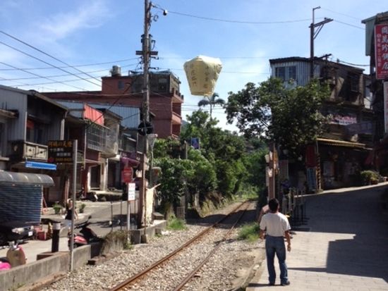 次の十分では、先に滝をみにいきましたが、期待しないようにとのコメントがあったのでまぁその通り。が、途中平溪線の線路の上を歩けるのがとても新鮮でした。結構他の人もはまっていました。なかなか落ちずに歩くのは平衡感覚が必要。お目当ての天燈飛ばしは、あいにくの強風で許可が降りず。願いごとだけ書いて後日あげてもらえることに。