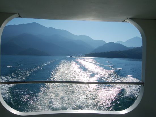 当日は、日月潭近くのプーリにある紙工場で実際に紙漉きから紙を作ったり墨で絵を描いた扇子を作り、十数年前に数千人の犠牲者を出した地元の大震災時に神戸から送られて移築したという実用的でしっかりとした造りの紙で出来た教会を見学してから日月潭へ。日暮れの湖面を眼の前において地元台湾料理をいただきました。翌日は朝一番の遊覧船で湖へ。ここでも早朝のためか、客は我々だけの貸し切り状態で湖上の空気を満喫しました。その後、台中で宝覚寺と最近落成した曲線だらけでガウディ設計かと見まごう(実は日本人設計)オペラハウスを観光しました。宝覚寺は今回初めてで、我々のリクエストで行っていただいたにもかかわらず、ガイドさんから寺の詳しい縁起を聞くことができました。