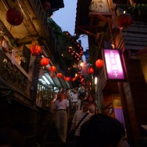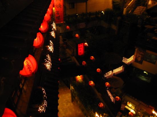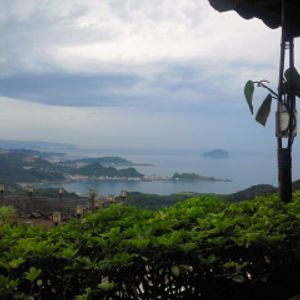 台湾旅行に出かける前にこちらのHPの書き込みを見てよさそうなので参加させてもらいました。夕刻出発なので、高いところからの風景はあきらめていたのですが、九ふんについたときはまだ夕暮れで海を望む素適な景色も楽しむことが出来ました。小さな場所なので散策してお茶を飲む時間は十分にありました。町中よりもだいぶ涼しかったので屋外の海を望むテラスのあるお茶屋さんに入りとてもくつろぐことが出来ました。