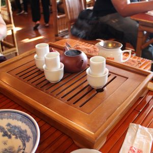 阿妹茶酒館も大混雑でしたが,5分位の待ち時間で座ることが出来ました.なかは意外と広いです.メニューは言えば来るのかもしれませんが,ほぼ全員,お茶セットで,店員さんもすぐに,お茶セット4つね,と言い,他の選択はない雰囲気でした.とにかく混んでいましたし.ただ窓際の席で,雨が降っていなければ,街並みや遠くの海が見えてきれいだっただろうと思いました16時過ぎで提灯の火も入ってきました.お茶セットは正確な額は忘れましたが,お茶菓子とお茶としては割高です.ただ,独特なお茶のいれかたや独特の茶器など,楽しめました.領収書がわりなのか,ひとり1枚,きれいな絵はがきをくれました.食事が目的なら近隣の店でもよいですが,やはり九份観光のメインでしょう.
