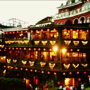 今回は、夕暮れ時を楽しむため、買い物は早々に切り上げ、日暮れ前から、某アニメのモデルと言われる茶屋の道向かいのレストラン?に陣取りました。その店でも一番眺めがいい場所を確保し、ビールをたらふく飲みながら過ごしました。どんどん日が暮れ、茶店の提灯が映え出すと風情が出てきて最高でした。
