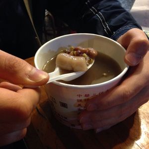 現地でヨモギ餅は食べました。1つや2つなら並ばずに買えますが、のんびり選ぶ間もなく、人の流れに任せて購入すると「芋」だったので、再度トライしアンコタイプを購入。ちなみに中国語で「赤小豆」と書いています。これはおいしかったです。
