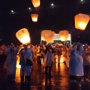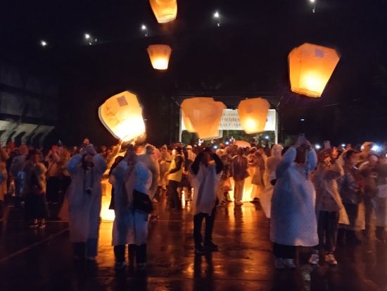 ランタン祭の会場場所は例年雨が多いらしく、当日も雨でした。土砂降りでない限りイベントは実施できるそうです。ツアーの方でレインコートを用意していただいてたので助かりました。ランタンを上げる際は傘はさせないそうです。